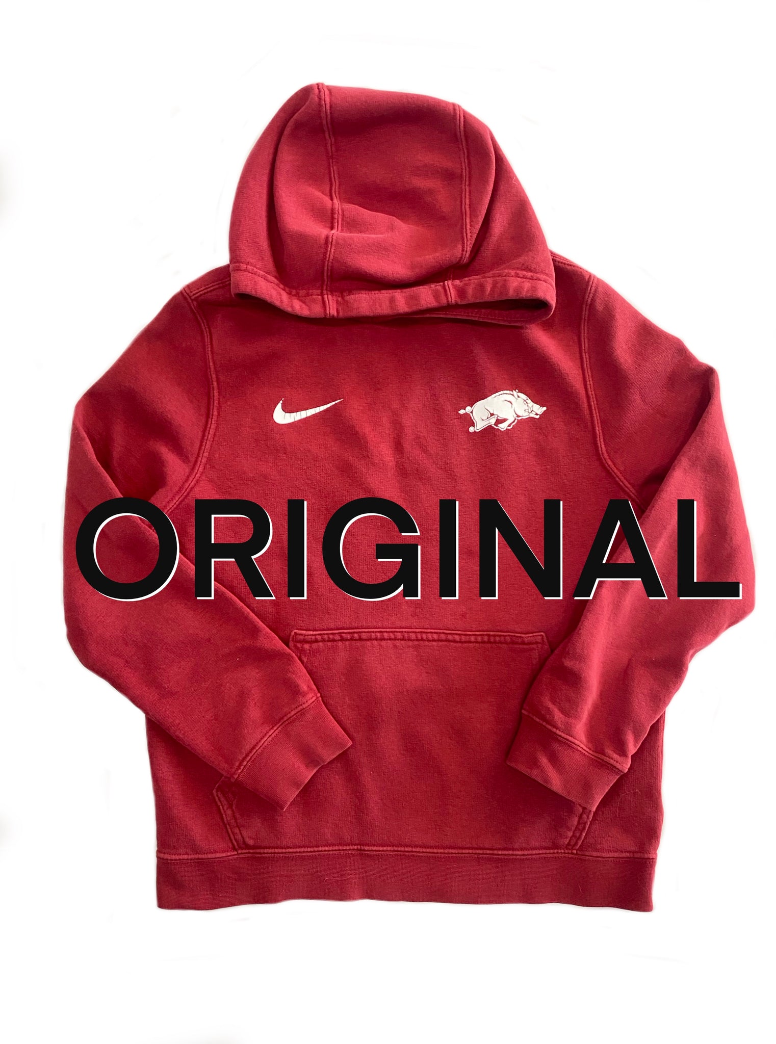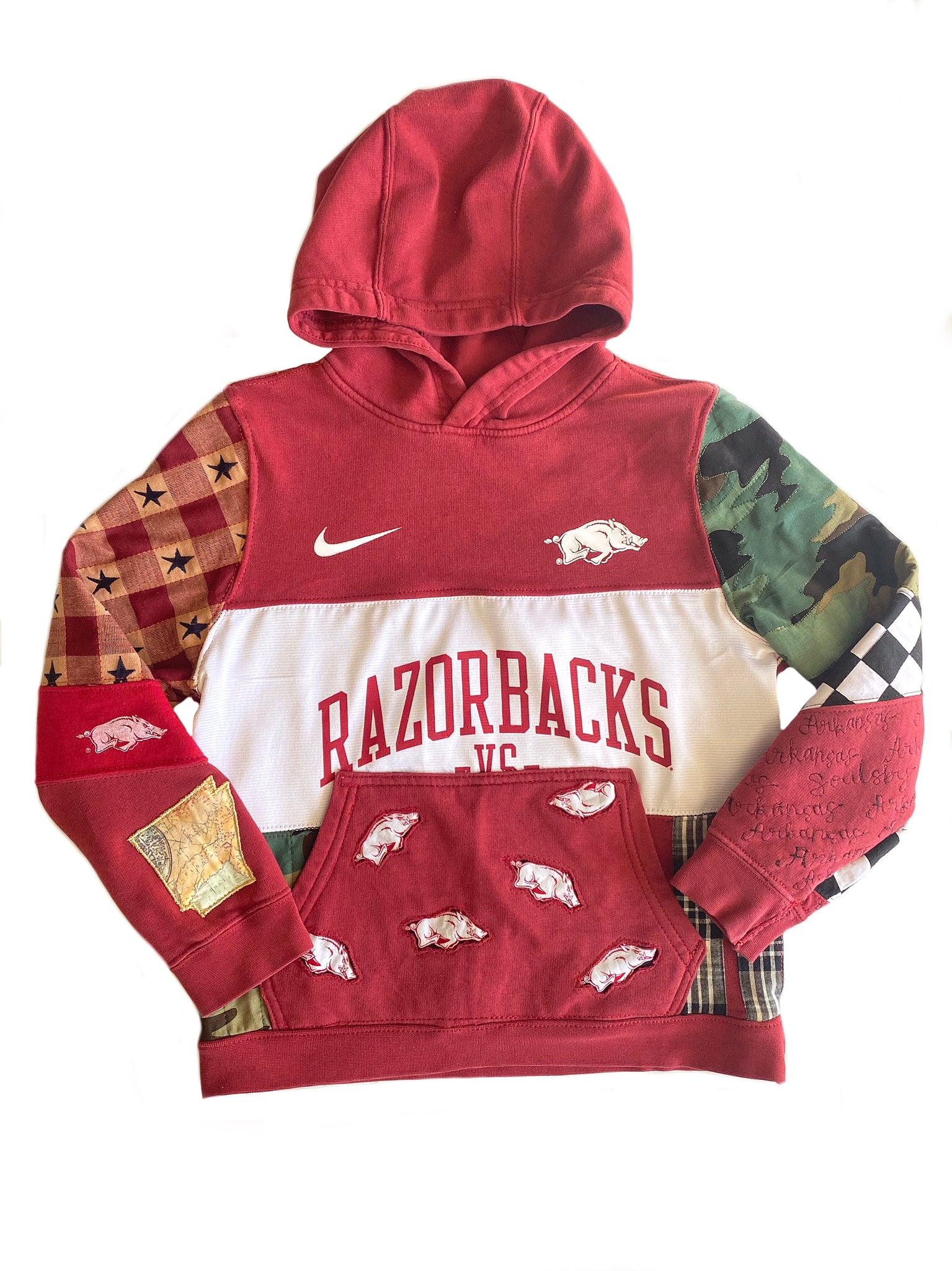 This is a one of a kind fashion hoodie made from a second chance Boys Club Fleece Nike Hoodie style # B31048. This hoodie has been reimagined with patchwork that features both fun fabric designs, custom Arkansas patch, vintage razorback fabric & Razorback t-shirts / game towels. The Nike & Razorback original logos remain in their original location on the chest & have been repaired to fix cracks that occurred with age & wear.